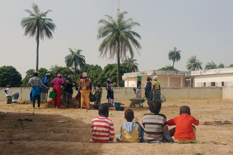 Senegal. Les dones del poble ens ajudaven amb entusiasme a preparar el terreny per al projecte. A la sortida de l’escola, els nens i nenes venien corrents cap a l’obra, un lloc perillós per a ells. Era difícil no deixar-los participar, era com frustrar-los. Asseguts miraven expectants què feien els grans. Carregar una galleda d’aigua o de sorra els hi semblava un honor.