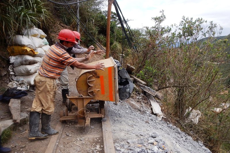 Colòmbia. Dos miners de la Cooperativa Minera La Llanda tiren muntanya avall les roques sobrants d’una voladura.
