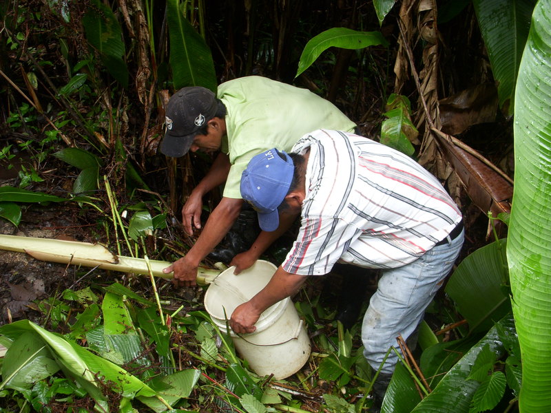 Hondures. Lo que se desea transmitir es la capacidad de la gente que nos acompañó para improvisar métodos que nos permitieron medir el caudal de una fuente natural. Este punto es más relevante de lo que parece, debido a que el resultado decidirá la construcción de un sistema de agua o no.