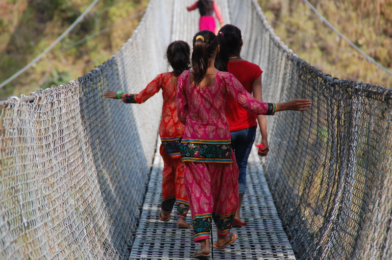 Nepal. Des de ben petits les nenes van vestides amb “curtes” plenes de colors que moltes vegades contrasten amb els carrers bruts, les capes que hi ha per tot arreu i els nous materials de construcció que comencen a envair els petits pobles.