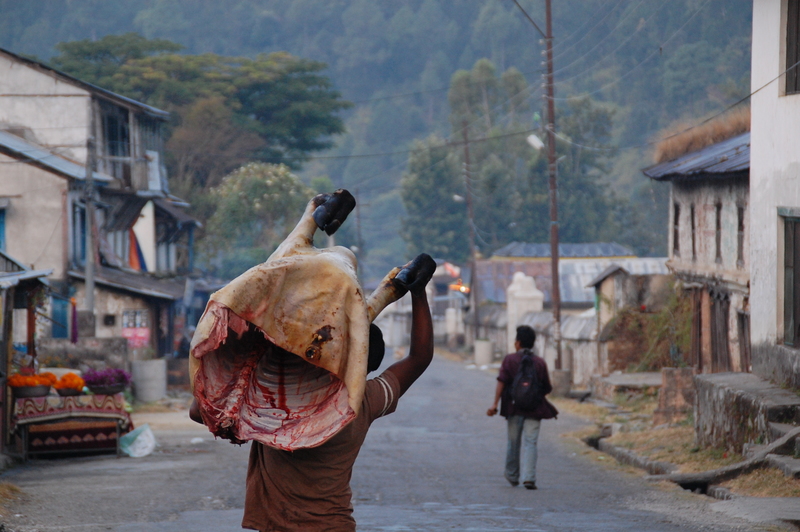 Nepal. La carn és un bé molt preciat a Bhimphedi, i la majoria de famílies només es poden permetre menjar-la un cop a la setmana. Maten les búfales a una transitada plaça i tallen i venen la carn a una petita botiga del carrer principal.