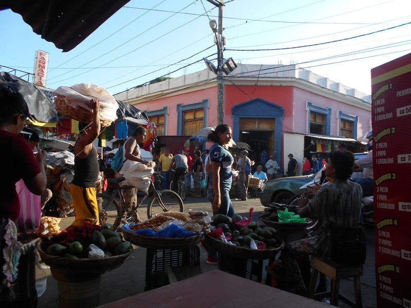 Nicaragua. Fotografia realitzada en el Mercat de Granada feta des de la visió dels venedors d’unes paradetes de fruites autòctones. A partir d’aquest punt de vista, es pot observar l’aglomeració de gent que es pot arribar a moure en un mercat i, també, dos mitjans de transport de petita mercaderia, per mitja una bicicleta o una cistella portada damunt del cap.