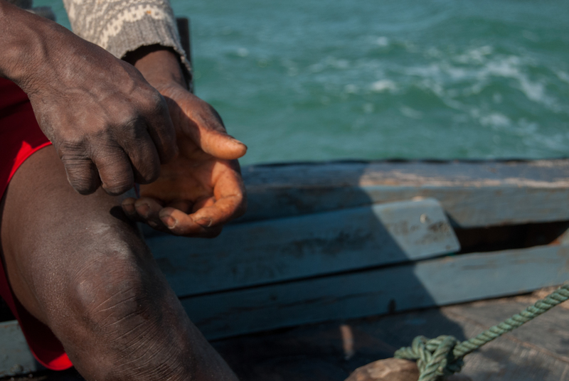 Moçambic. Durant la meva estada vaig tenir l’oportunitat de fer una petita excursió amb un pescador local, el Senhor Jose. Va ser tota una experiència anar amb una barca de vela feta totalment per aquest humil pescador i sense motor. Tota una tècnica conèixer les marees i com avançar quan el vent ve de cara. Tant de treball i esforç es veuen reflectits en les mans d’aquest humil pescador.