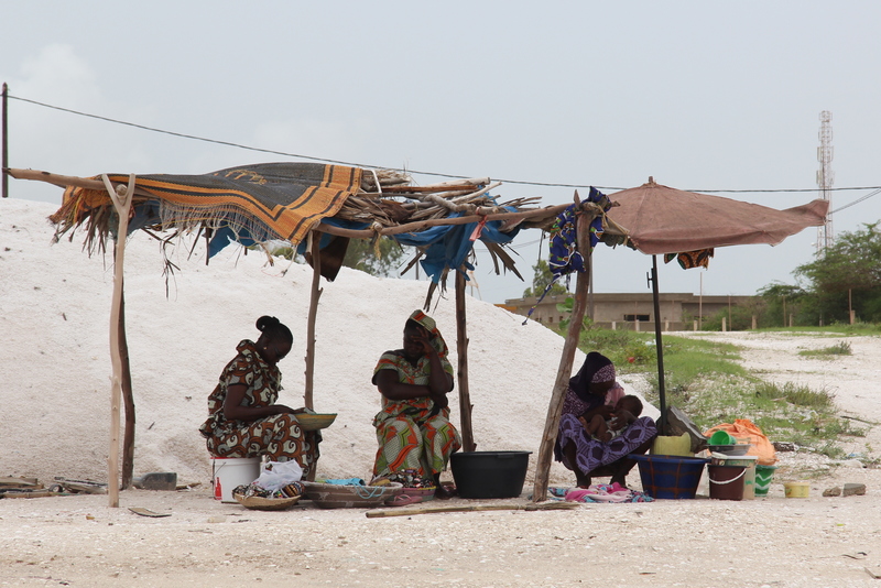 Senegal. Mostra tres dones concentrades en tres tasques diferents, cuidar un infant, aconseguir un plat per dinar i intentar vendre alguna polsera.