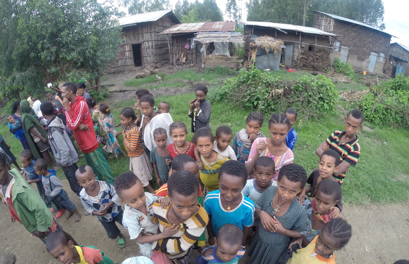 Etiòpia. Una punxada a la roda obliga a aturar-nos una mitja hora al bell mig de la carretera. Som propers a un poble molt petit i des seguida veiem una corrua d’infants que s’acosta a fer el xafarder. Aprofitem l’estona per cantar plegats unes cançons i intercanviar quatre paraules que sabem en amhàric. N’hi ha que ens observen amb una timidesa notòria i fins i tot s’amaguen darrera els seus amics intentant passar desapercebuts.