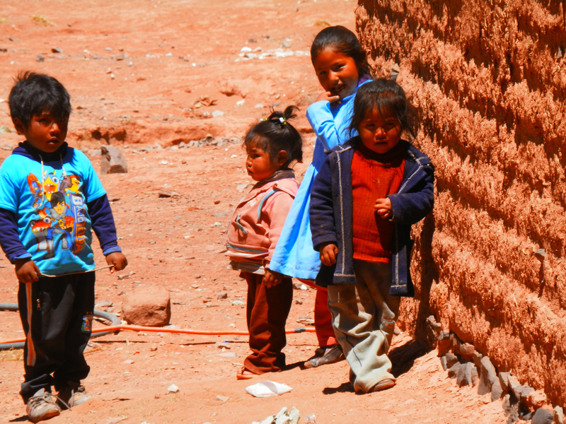 Bolívia. Aquests nens de l’altiplà Bolivià observen com arriben turistes a fer una parada durant els tours que s’organitzen pel Parc Nacional Eduardo Avaroa. Aquest poble està situat a uns 4.000 metres d’altura, i els nens tenen les galtes cremades del sol i del fred, tret identificador dels nens de l’altiplà. Els turistes s’aturen a dinar durant el tour de quatre dies en aquest poble situat en mig del parc Nacional, els nens no paren de saludar i somriure a tothom en aquesta breu estona que comparteixen. Els turistes paguen molts diners per aquests tours, són dos mons completament diferents que s’uneixen per uns moments.
