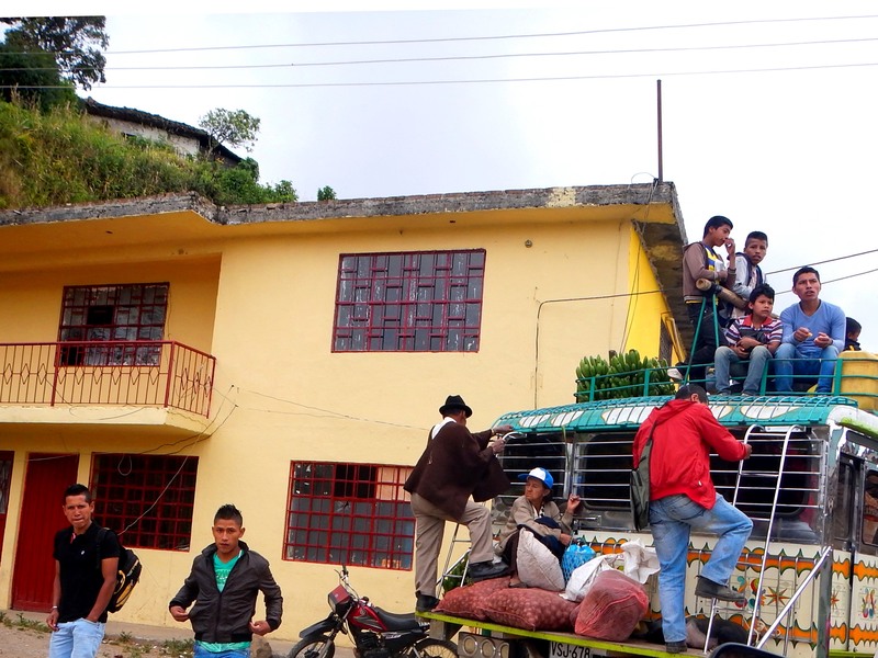 Colòmbia. La Chiva, l’autobús típic de Colòmbia, fa parada al Poble de La Llanada. En ella s’hi transporten sacs de fruits secs, animals vius, plàtans, i la falta de seients no és cap problema per a la gent.