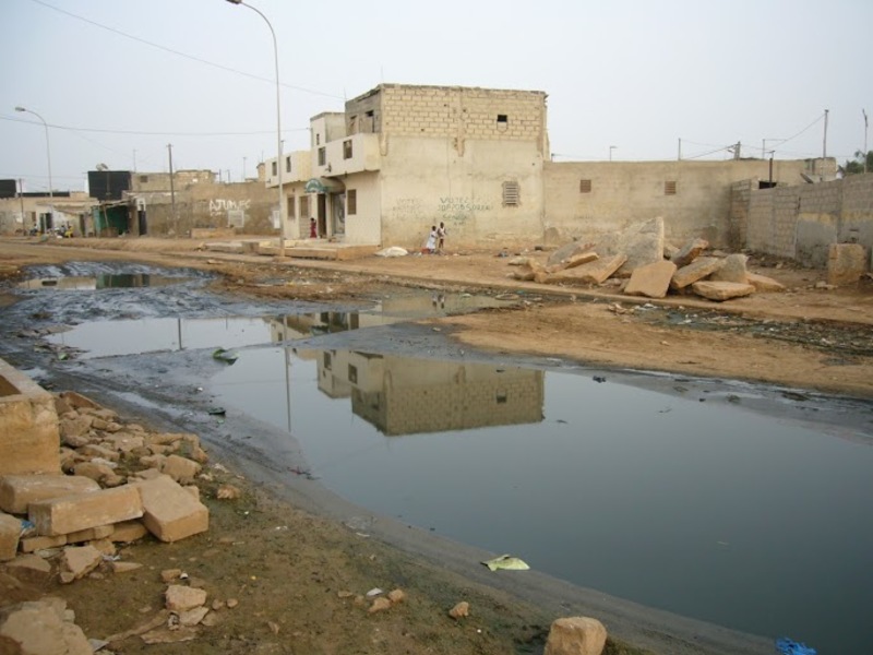 Senegal. Dins el barri de Sam-Sam es pot constatar com les cases es troben rarament acabades i els fils elèctrics pengen i s’estiren d’una casa a l’altre dins d’un desordre increïble. Els carrerons que conformen aquest barri, tot ells es troben immersos de sorra i plens de deixadeses, fet pel qual s’acaben trobant limitats en espai i acaben presentant una superfície bastant irregular que acaba dificultant en certa manera el desplaçament.- I és just quan el sol comença a pondre’s, que dins d’aquests carrerons hi acaba regnant una perfecta obscuritat degut a l’absència d’il·luminació.