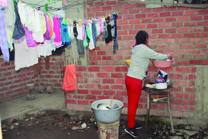 Perú. Marleny Capcha lava los platos en casa de su cuñada. Todavía no llega agua a asentamiento pero se apañan para reaprovecharla y hacer todas las labores domésticas. La familia Capcha Domínguez, una de las fundadoras del asentamiento, ha conseguido construir media casa en ladrillo. Las esperas a la vista reflejan la esperanza de todas las familias de seguir construyendo sus hogares.