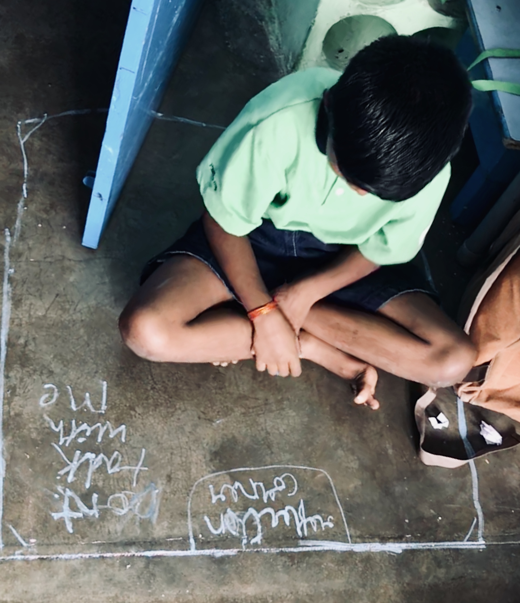 ÍNDIA. Aquesta foto l'he fet durant una classe de mates. Ens vam trobar aquest nen castigat. Es pot llegir escrit amb guix Don't talk with me i Reflection Corner, del revés. El nen no podia parlar ni sortir del quadrat. Tot i això era bastant entremaliat i no feia gaire cas.