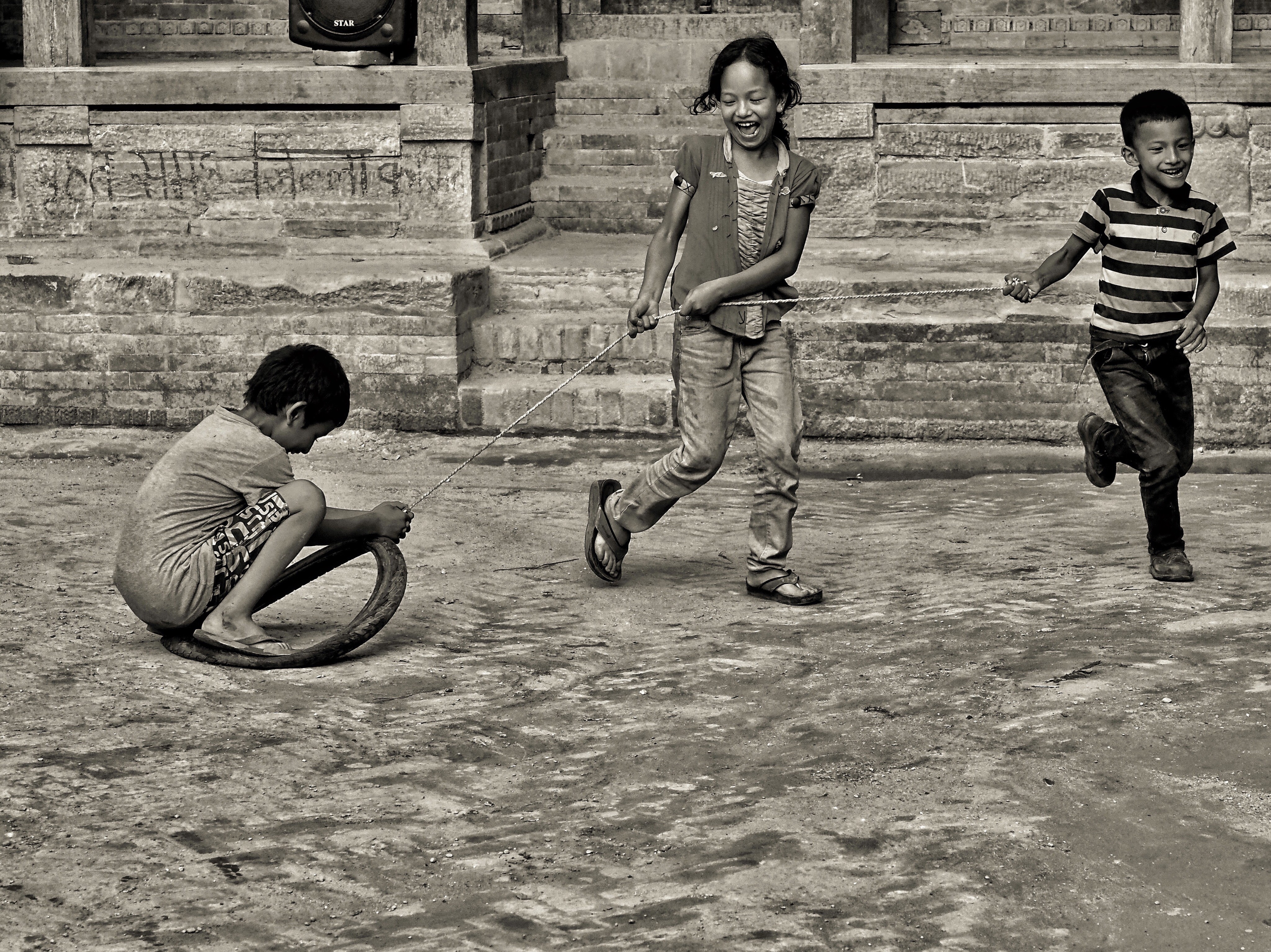 NEPAL. En un món on les joguines no són a l’abast de tothom, els nens que no poden disposar d’elles utilitzen el seu enginy i creativitat per passar-ho bé. Aquests han utilitzat un pneumàtic punxat i una corda per fer un remolc amb el que s'ho passen genial i a més a més fan activitat física.