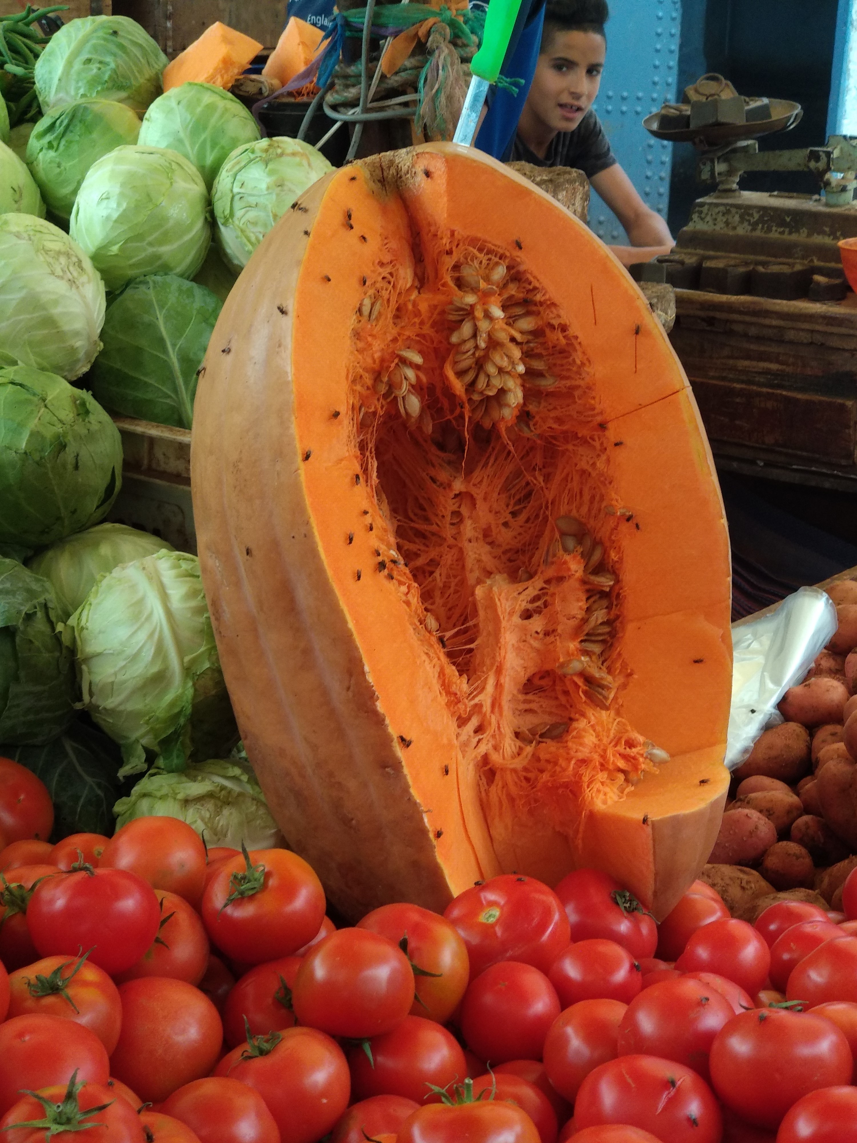 Era dia de mercat. Ocupava tots els carrers del centre de la medina i estava sectoritzat. Vaig fer moltes fotos, dels puestos de roba, de teixits, de betes i fils, de flors de plàstic, de sandàlies, de gallines i ous, de olives, etc. etc., però finalment he escollit aquesta imatge per la composició i el colorit. I això que al fer-la mes que res em vaig fixar en la mida de la carbassa i les mosques...