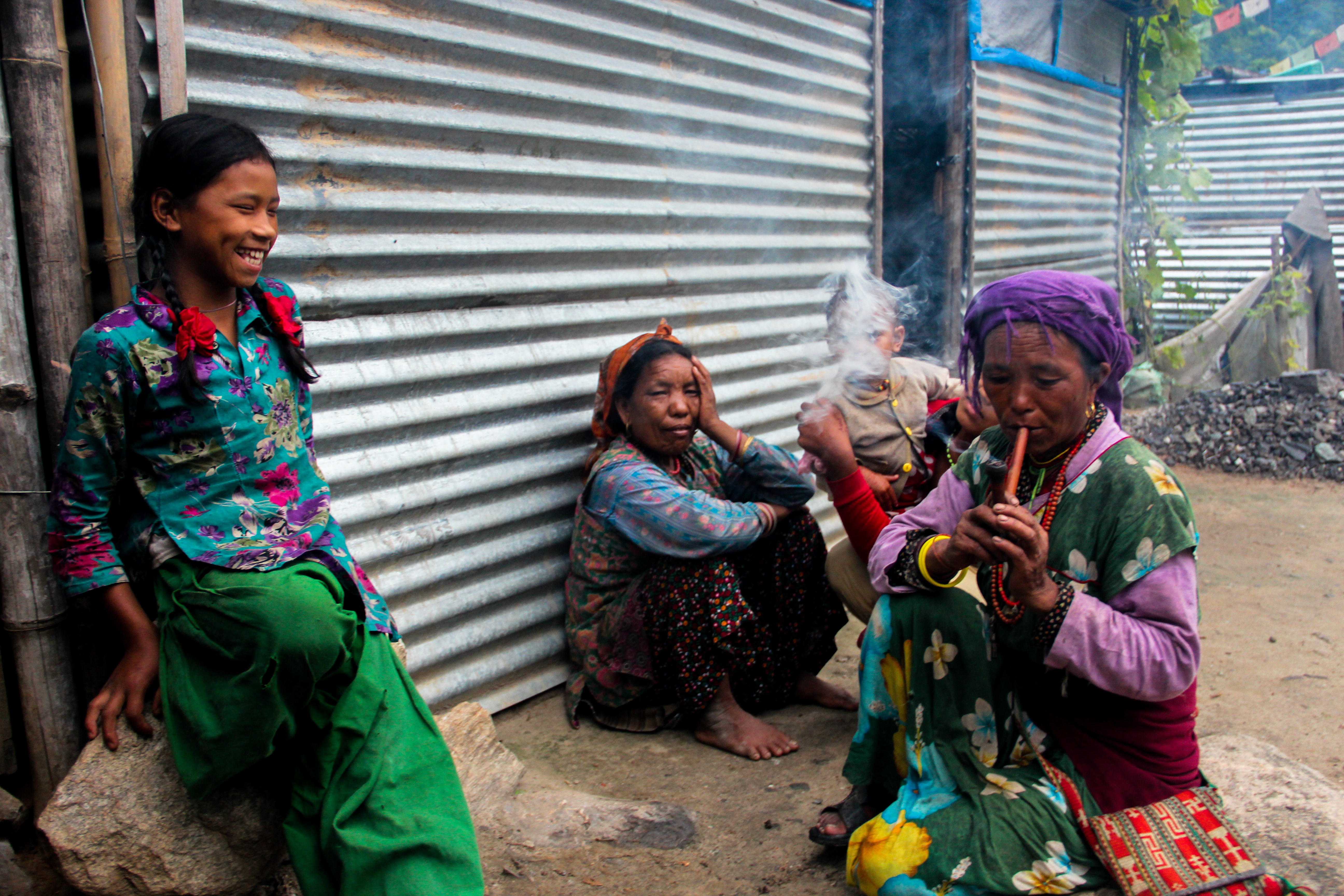 NEPAL. En un campament que el govern va fer per la gent afectada pel terratrèmol de 2015 aquesta família espera un habitatge. Al principi vergonyoses , i després una de les dones encén una pipa per ser captada per la càmera.
