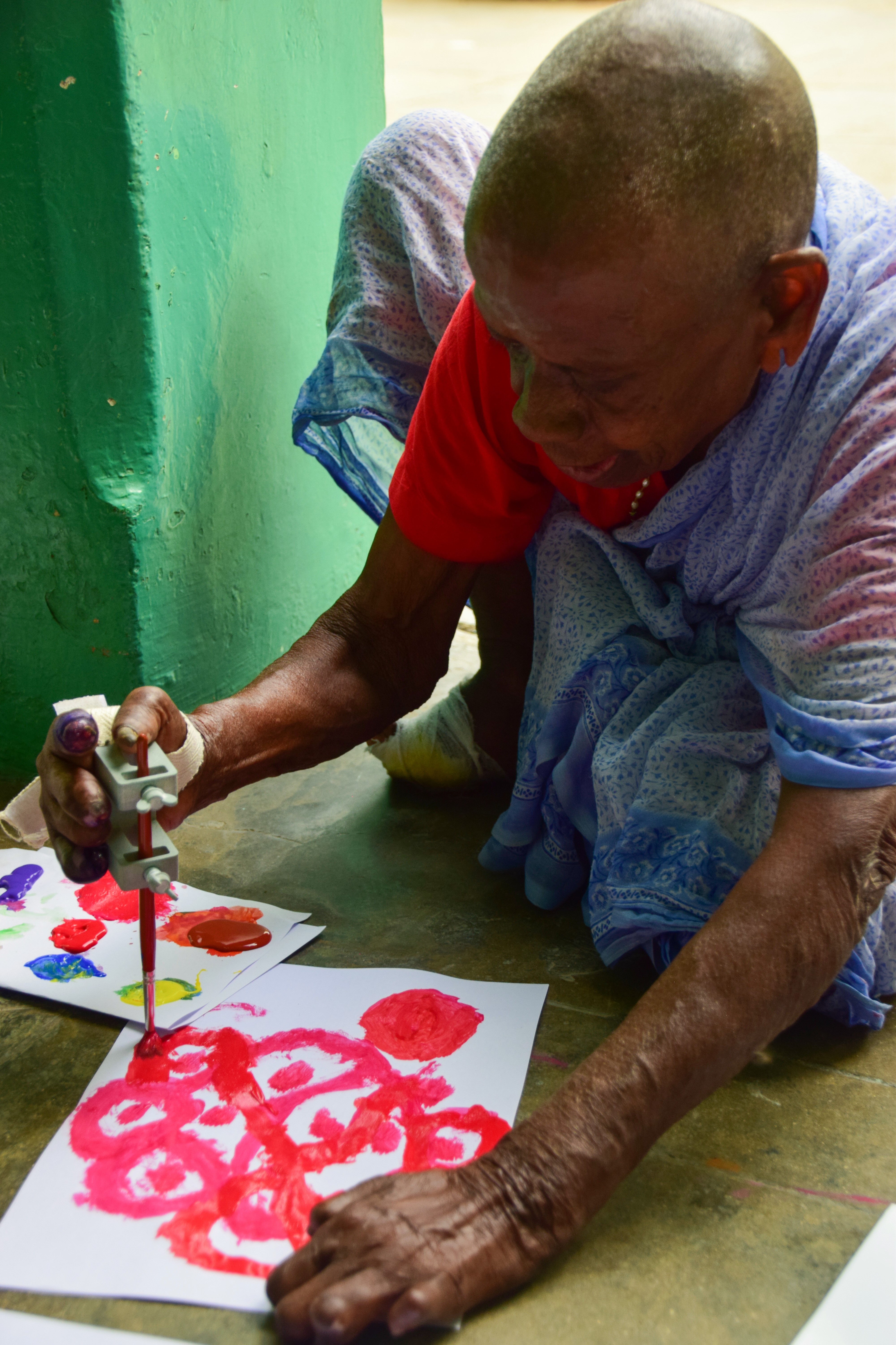 Vellore, Tamil Nadu, Índia. A Kanthammal, la resident més sènior del leprosari Cheshire Home, no la vam sentir mai parlar. No vam arribar a descobrir si era per timidesa o per incapacitat, però vam aconseguir que pogués expressar-se d'una manera diferent: pintant. La inflamació dels seus dits i les llagues no li permetien poder agafar llapis o pinzells, però gràcies a l'adaptador uHandle va poder passar llargues estones creant acolorides formes.