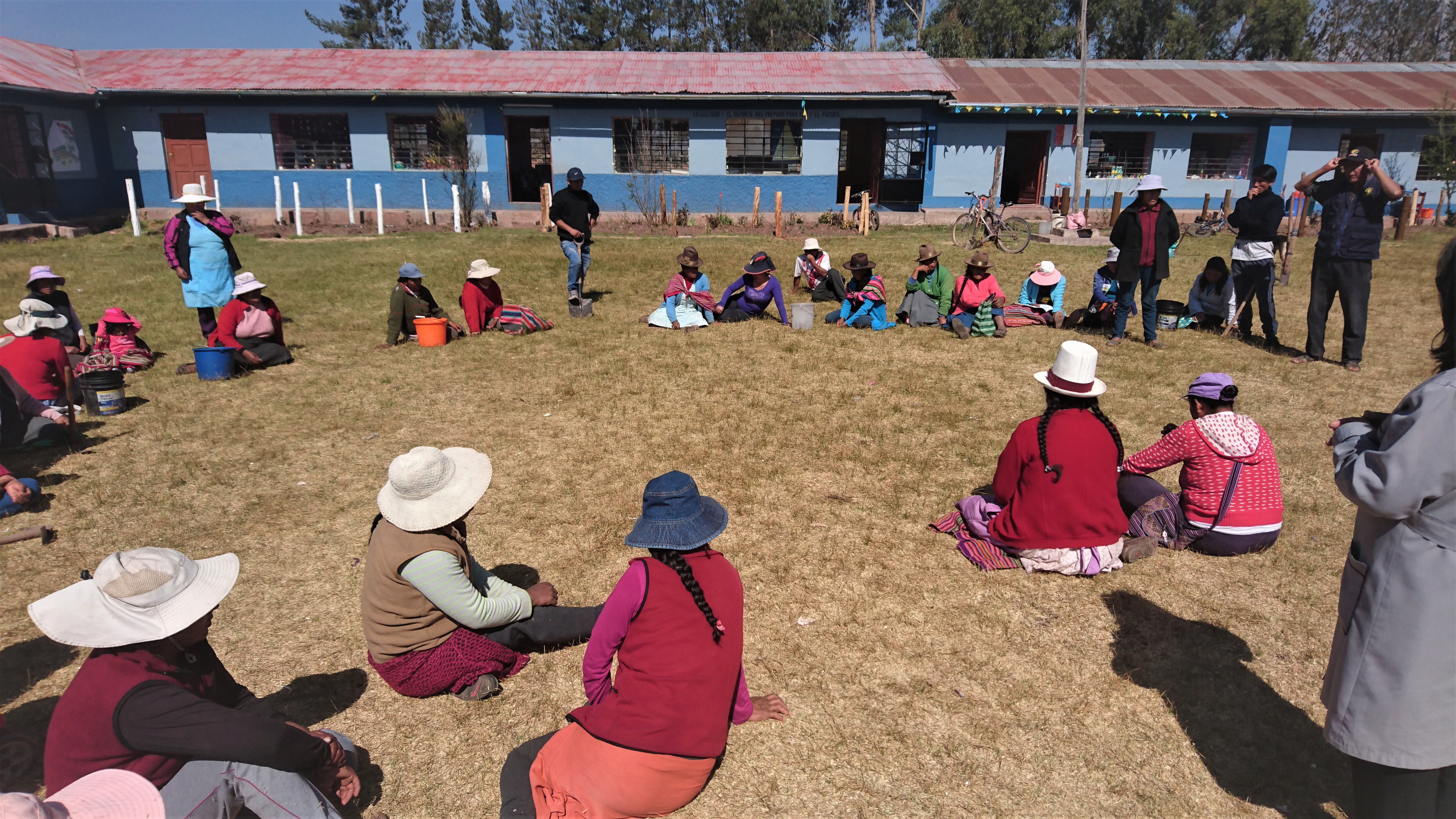 Escola Andina. Perú. Pares i metres de l’escola...... es reuneixen de manera assembleària per decidir en quins projectes invertir els diners que han obtingut al llarg de l’any, com ara les hortalisses que plantaran a l’hort, manteniment de l’escola, i barrera vegetal. Tanmateix són capacitats per entendre el funcionament de l’aiguamoll artificial que tenen construït que tracta les aigües dels lavabos, i es fa servir per regadiu.