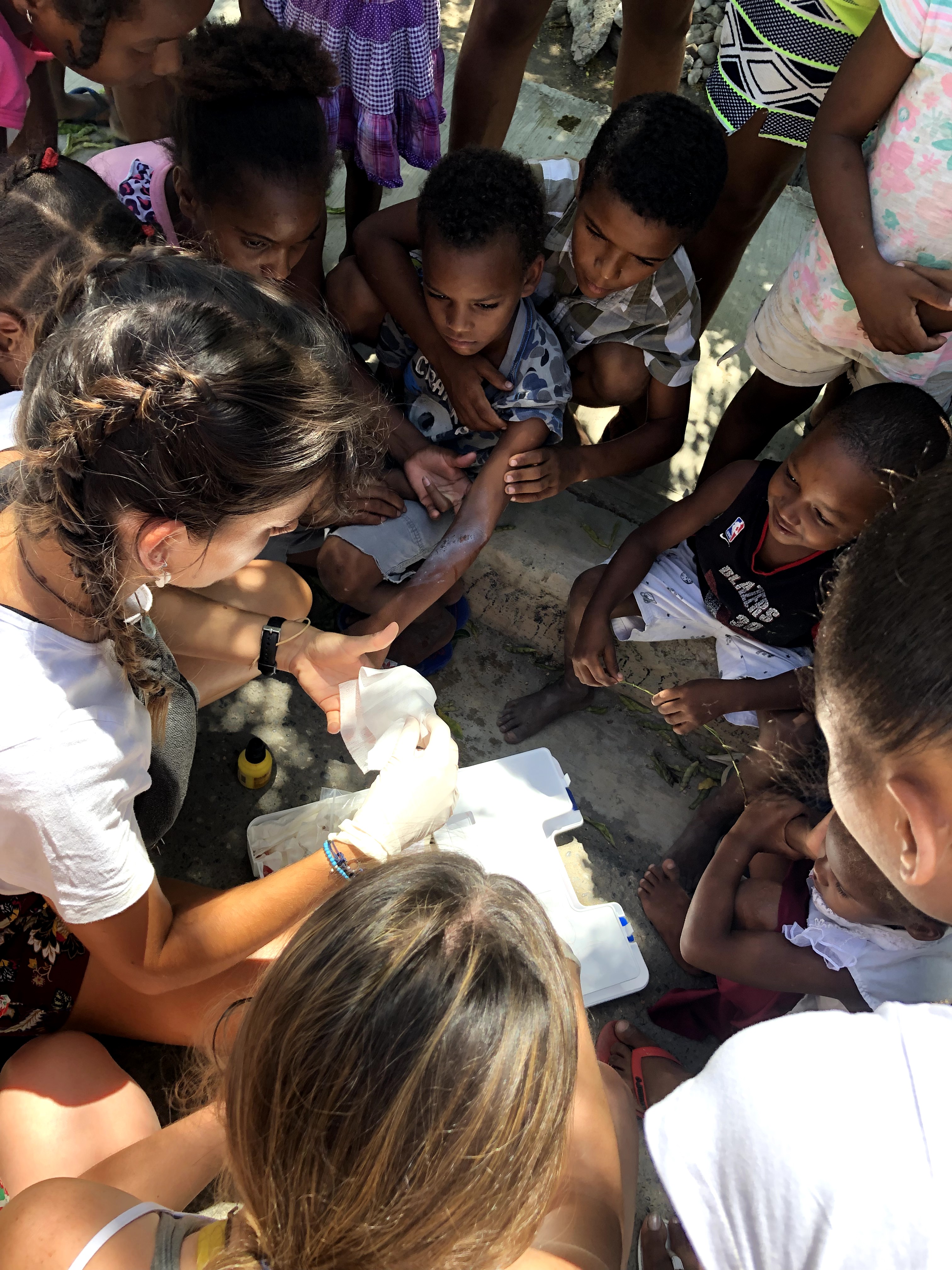 República Dominicana. La gran majoria dels membres de la comunitat dominicana amb qui col·labora “Sonríe y Crece” no tenen accés a una sanitat digna i mai han rebut una educació adequada de primers auxilis. Per aquest motiu, l’equip de la branca de sanitat de la nostre associació du a terme una sèrie d’accions a peu de carrer durant l’estada al país. L’objectiu es que, actuant a plena llum del dia, aquells curiosos i interessats tinguin unes nocions bàsiques per curar ferides pràcticament habituals en el seu dia a dia.