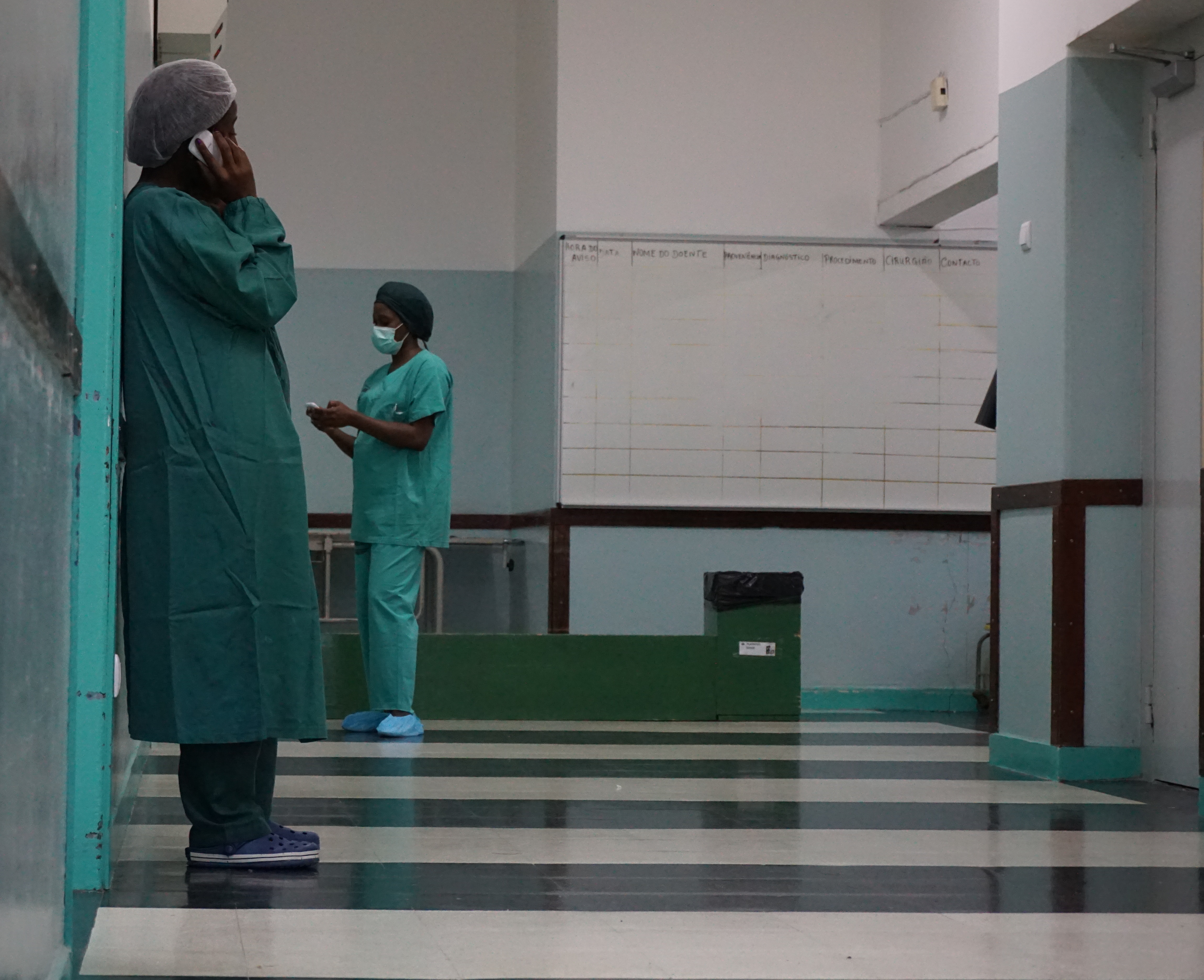 Moçambic. Doctora que parla amb la seva familia al passadís del quiròfan abans d'entrar a la següent cirurgia. Es reflecteix la cara i la posició de preocupació com qualsevol persona humana,.