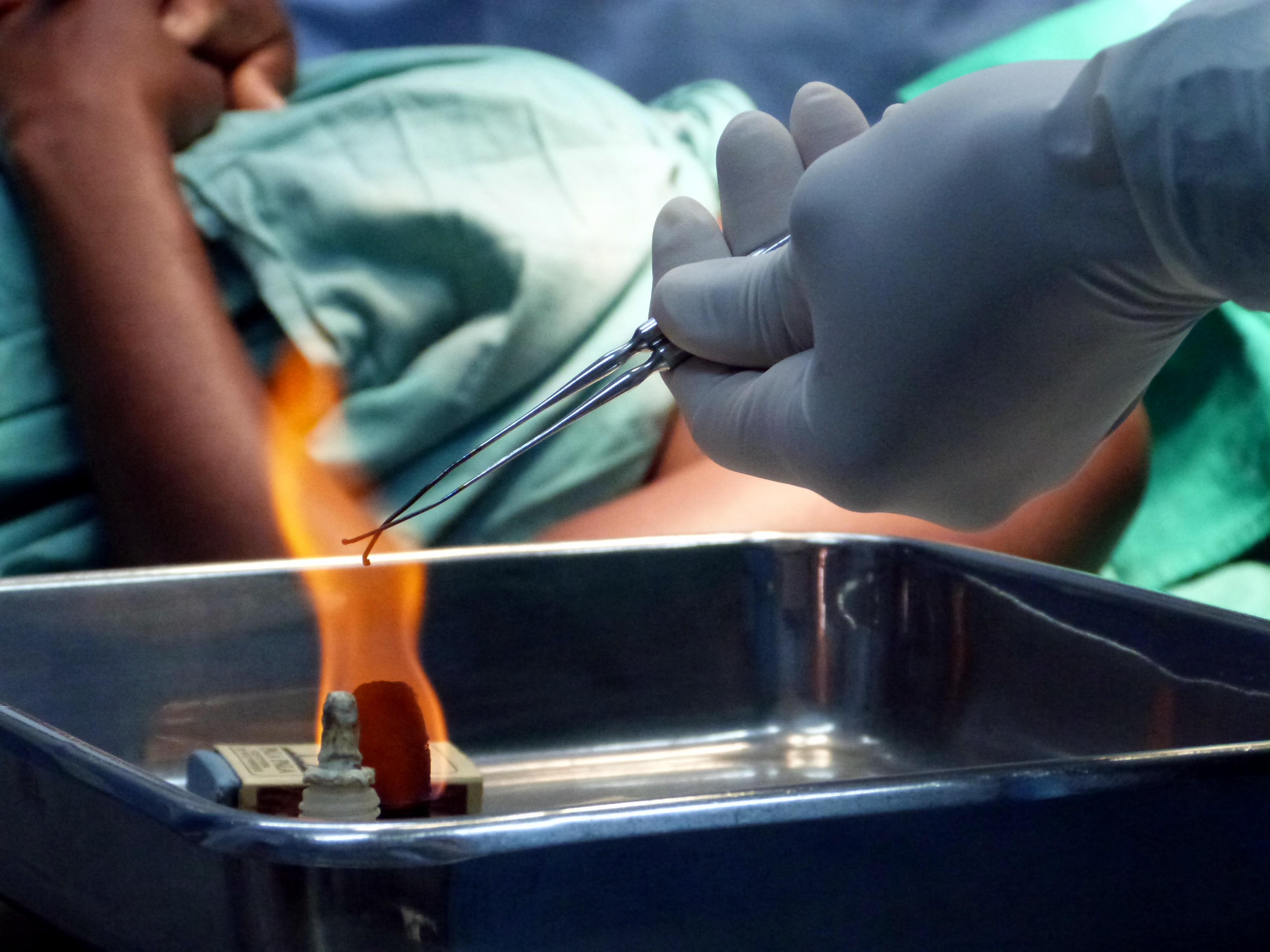 Moçambic. Abans de començar la cirurgia esteril·litzen amb foc el material que utilitzaran, d'aquesta manera cremen totes les restes de l'última vegada que el van utilitzar. És una manera d'esteril·litzar antiga, però no deixa de ser eficient en zones a on no disposen de noves eines.