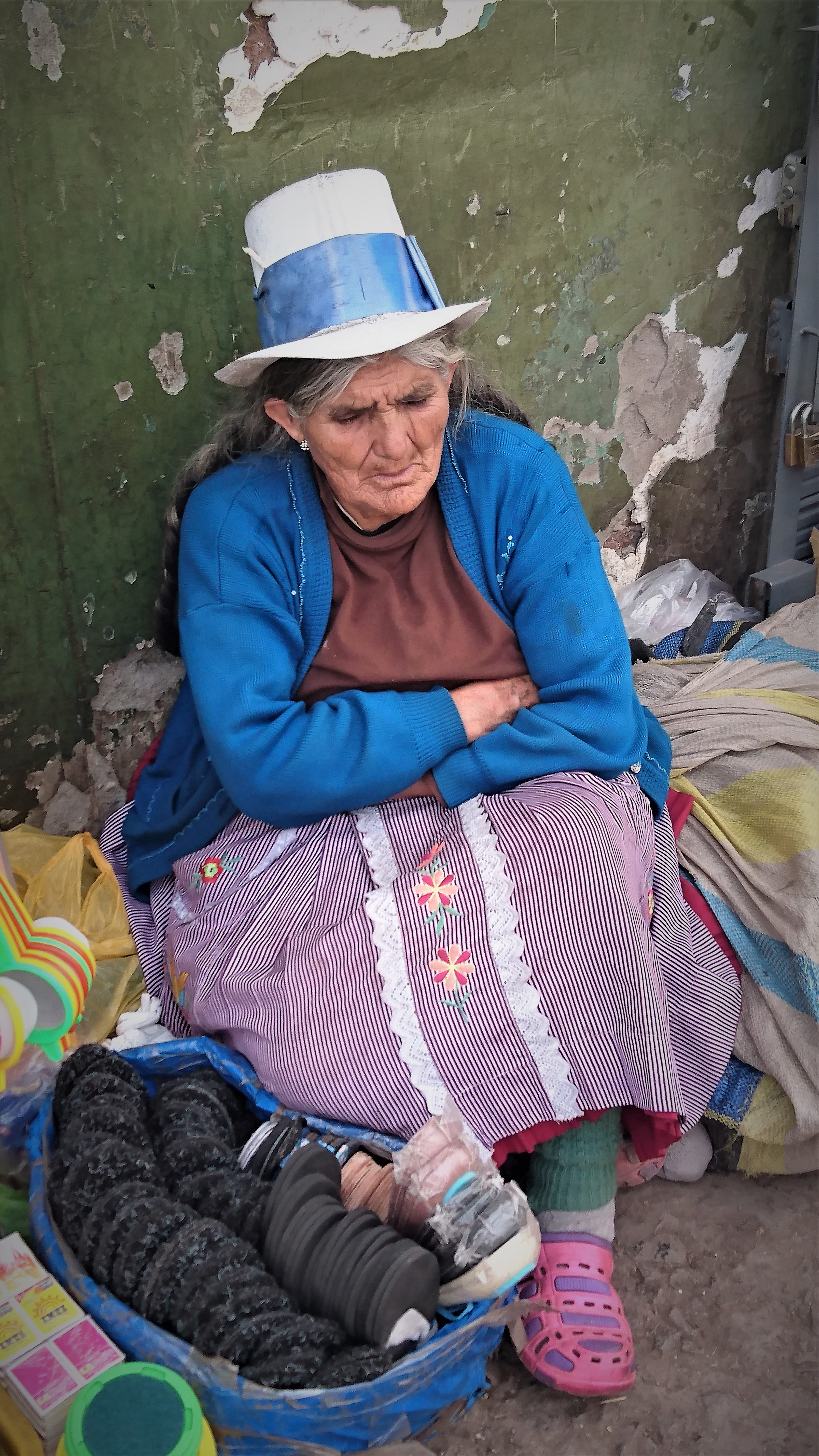 Perú. "Aquesta imatge és representativa de la tradicional dona cusquenya, que majoritàriament parla el quítxua, i sap quatre paraules en espanyol per comerciar. Embolica la mercaderia en una tela típica d'allà, molt resistent i de colors ben vius. Se la carrega a l'esquena, o la du a la mà, i agafa el bus ""colectivo"", si n'hi ha, per arribar al mercat a les 6:00 A.M. Entrat el dia de tant en tant li toca fer alguna petita capcinada. "