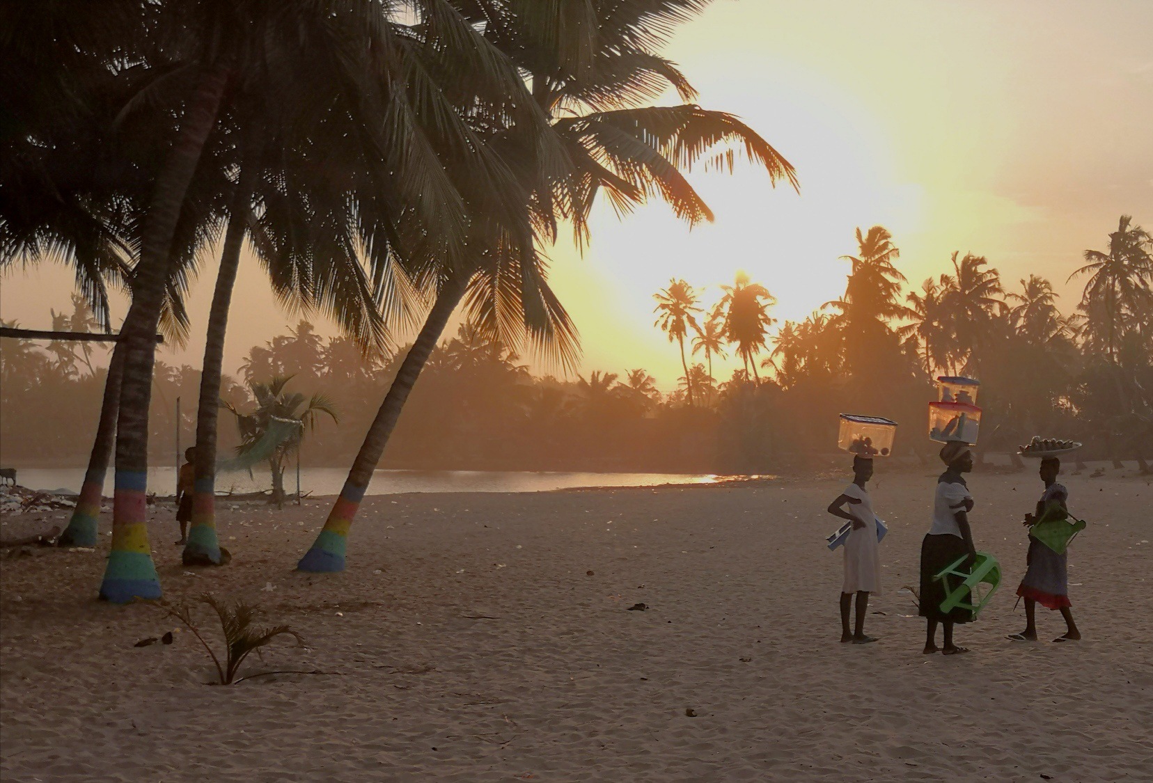 Ghana. Mentre tres nenes marxen, posen davant una posta de sol després de un llarg dia de treball a una platja amb característiques paradisíques. El fals paradís.