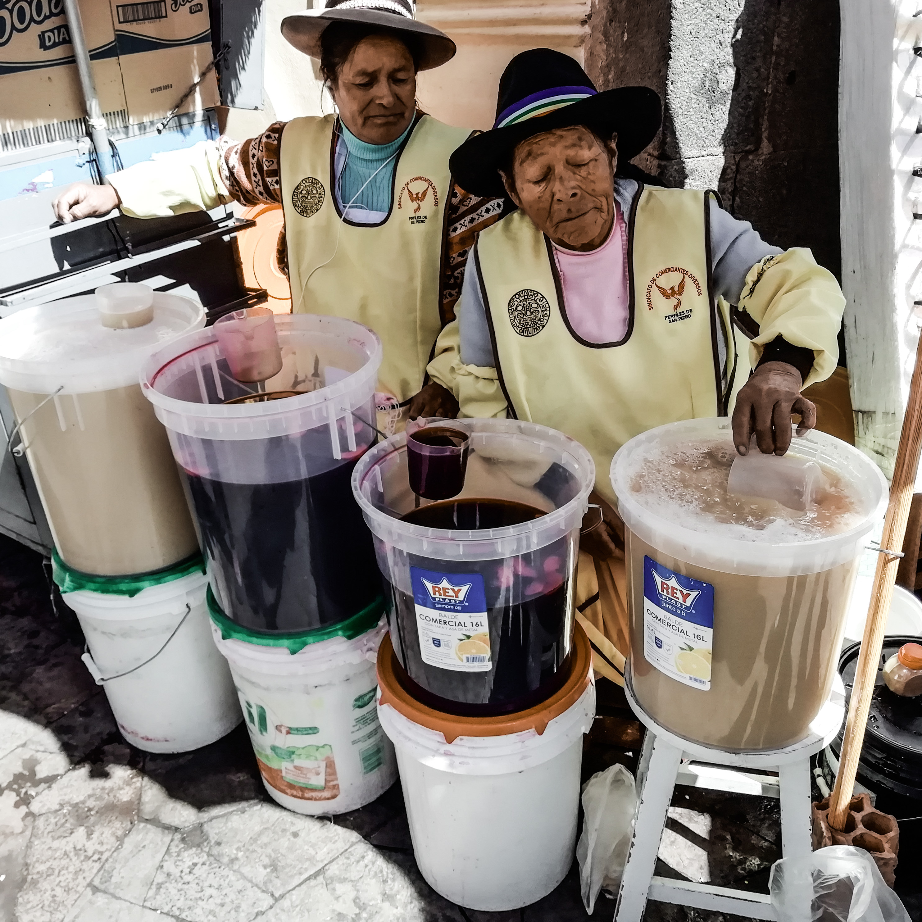 Perú. Fora els mercats de Cusco, i per el carrers, moltes vegades et trobes dones venent begudes típiques del país, en aquest cas trobem chicha morada i beguda de blat.