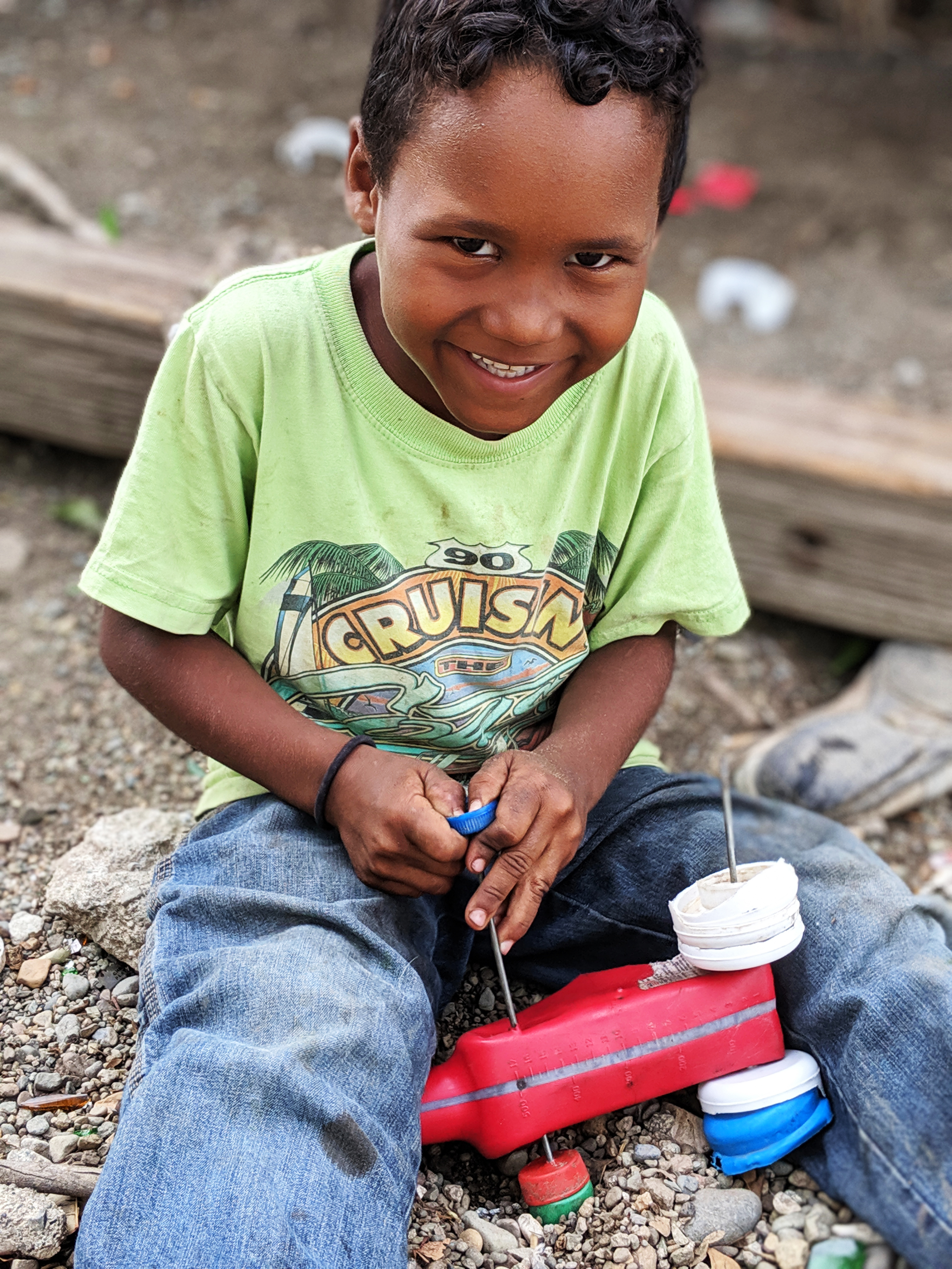 República Dominicana. Ell és en Wally, fabrica les seves joguines amb residus que troba als carrers fent ús de la seva creativitat. Un exemple admirable de simplicitat i reutilització de recursos per crear una joguina amb la que segur es divertirà.