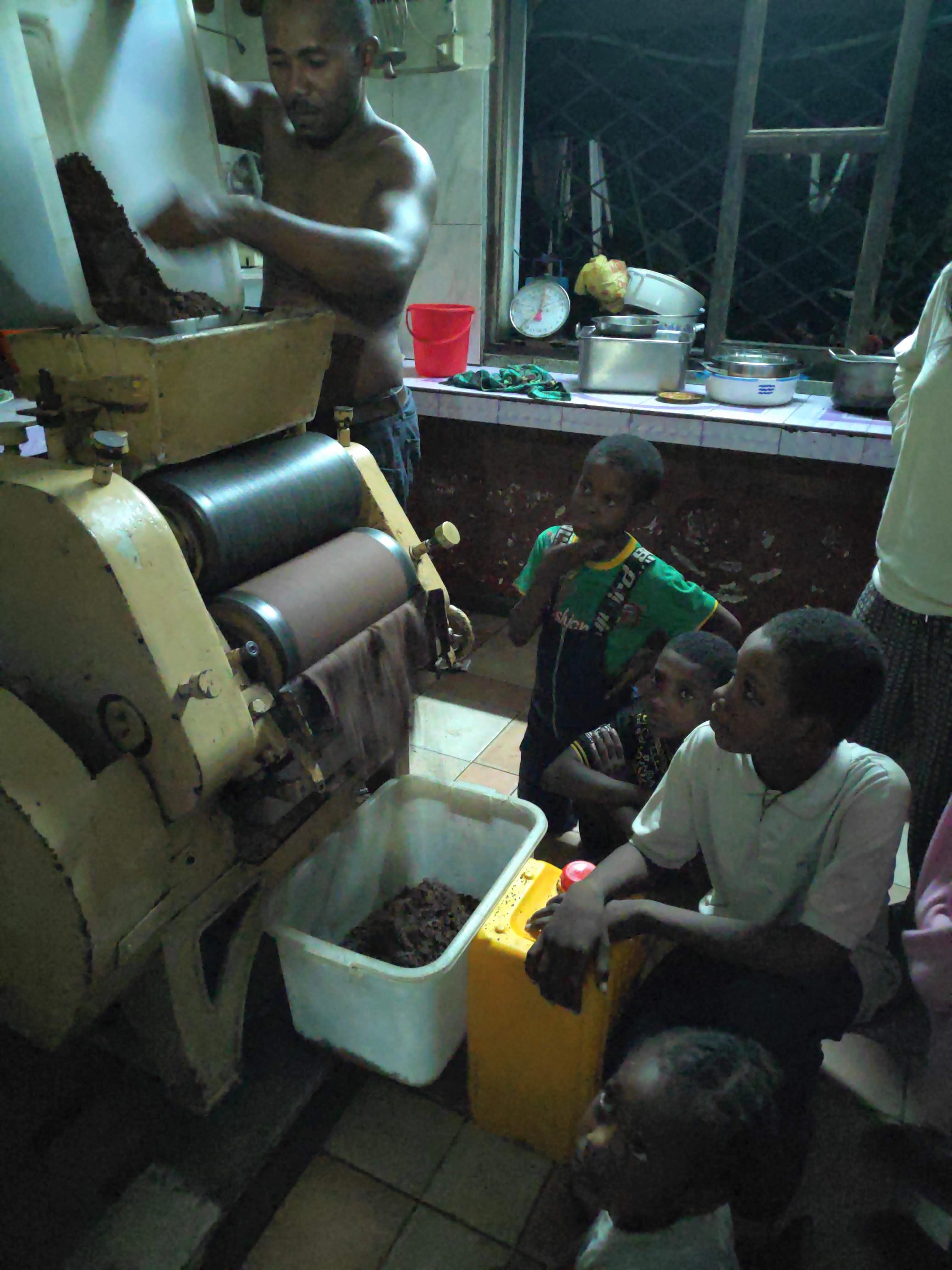 Madagascar. Un dels moments preferits pels nens de l’orfenat és sens dubte quan arriba l’hora de moldre el cacau. Embadalits, miren com els grans passen per la màquina i és van transformant en la suculenta pasta que després es barrejarà amb sucre i farà les delícies dels més llaminers.