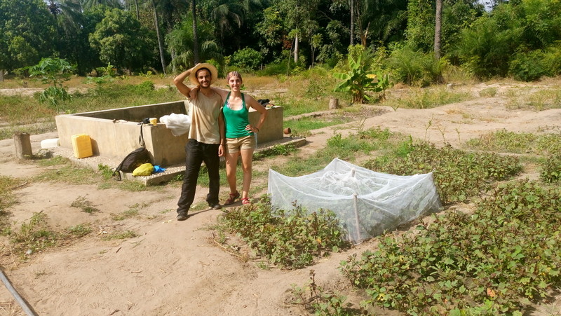 Autor: Jordi Izquierdo. Senegal. Una de les activitats realitzades va ser dur a terme un mini-assaig per veure l’eficàcia de dues matèries actives insecticides contra la llagosta, que era una plaga molt important en molts dels horts. Vàrem utilitzar material local com la tela mosquitera per protegir l’àrea tractada de l’arribada de noves llagostes, sostinguda per petites estaques que ens van fer. Al darrera es pot veure el pou d’abastament d’aigua de l’hort.