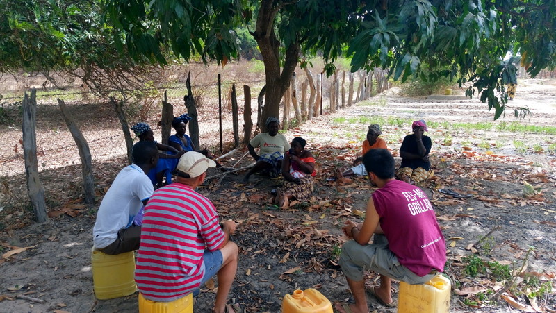 Autor: Jordi Izquierdo. Senegal. Les visites als horts de les cooperatives de dones i la reunió amb elles “in situ” és una de les activitats desenvolupades durant la nostra estada. En aquetes visites, a més de veure l’estat de l’hort i el maneig que en fan, es parlava amb elles sobre problemes i possibles solucions en cadires “improvisades”.