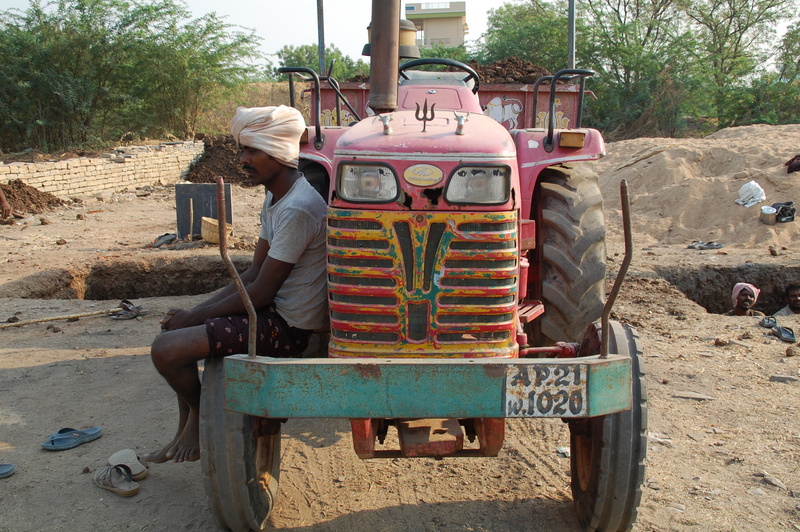 Autora: Andrea Llanas. Índia. Un hombre descansa a la sombra del colorido tractor después de un duro día de trabajo en la obra.
