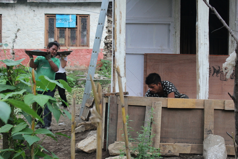 Autor: Marc Crespo. Nepal. En aquesta imatge hi apareixen treballant conjuntament els beneficiaris del projecte amb els voluntaris del projecte a Bhimphedi durant l’octubre de 2016. Podem observar com es pavimenta el porxo de la primera casa del programa AWASUKA. Aquesta casa es ja propietat de la Maya una beneficiaria del programa que vivia des de el terratrèmol en una petita vivenda de xapa metàl·lica.