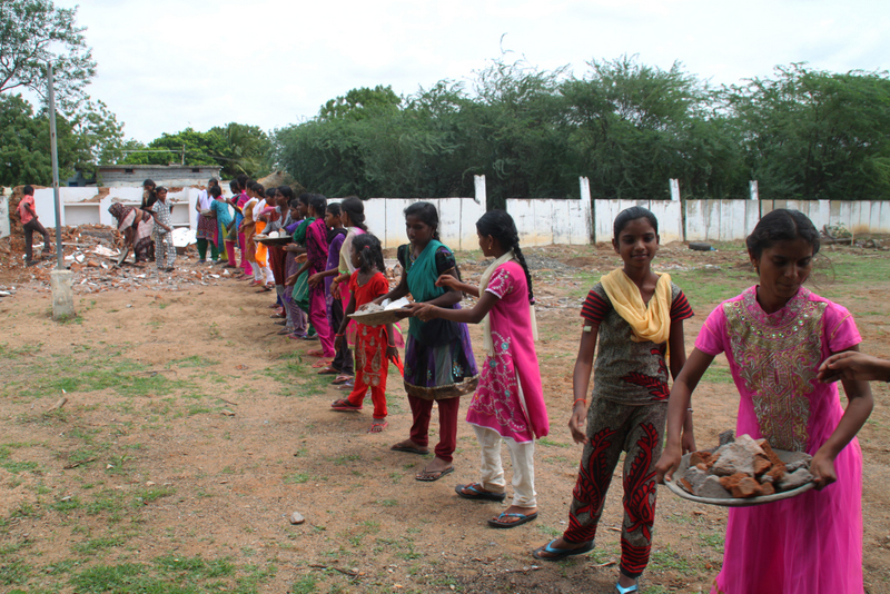 Autora: Elisenda Planell. Índia. La fotografía vol mostrar el treball en equip de les nenes del centre d’Haribala. La unió i el companyerisme fa que les coses espuguin dur a terme, i allò que pot semblar impossible, mica en mica, com fan les formiguetes, s’aconsegueix. També vol posar en valor la tasca de les dones i les nenes en una societat on se les discrimina i on els seus drets no sempre són garantits.