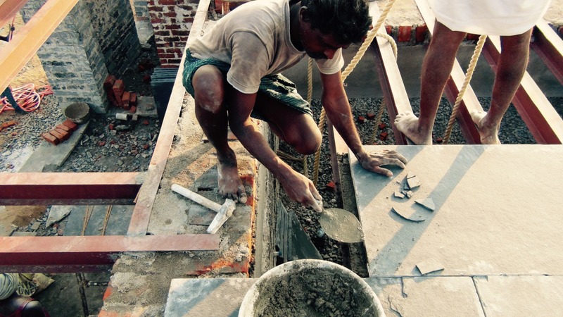 Autora: Èrika Torrents. Índia. Moment àlgid de la construcció del forjat, capa a capa, creuament de materials i traves, equilibri i composició de formes i colors, contacte directe ànima, i cos amb la feina que s'està fent. Amb els peus a l'obra!