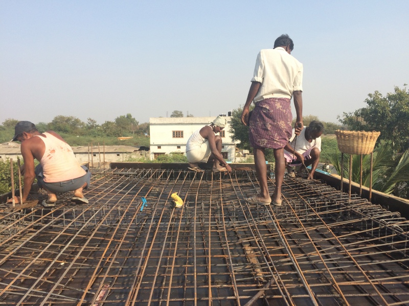 Autora: Èrika Torrents. Índia. Concentració, aprenentatge, i posició, mescla de cultures. Constructors de Koilakuntla fent una llosa amb bigues embegudes a l'estil europeu. Aprenen els uns dels altres a cada pas.