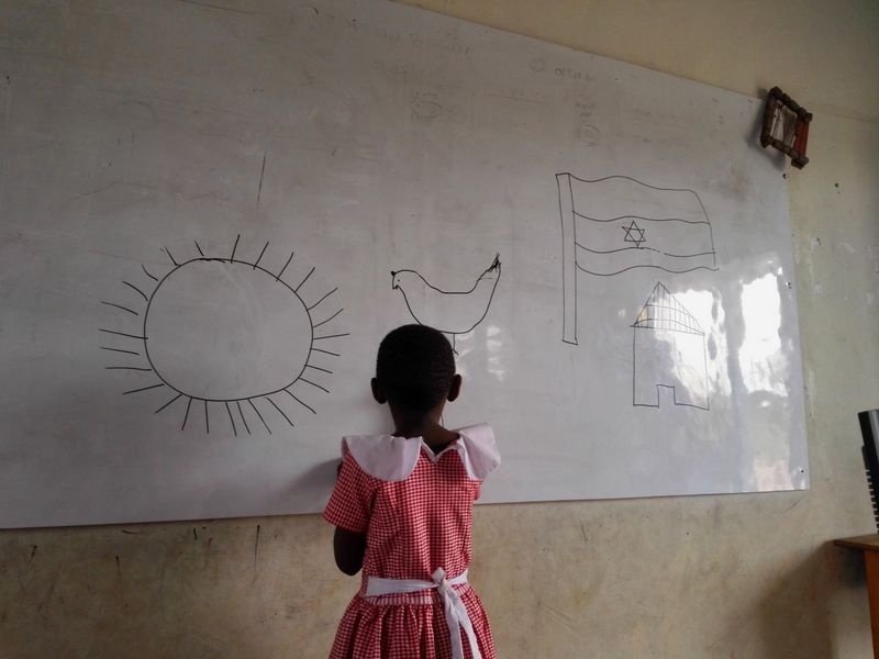 Autor: Pere Camps. Ghana. L'Angelina, en una estona de lleure, es distreu dibuixant a la pissarra. En tots els dibuixos mai hi falta la bandera de país, del qual estan molt orgullosos. En aquest instant, l'Angelina se sent feliç, lliure i tranquil·la.
