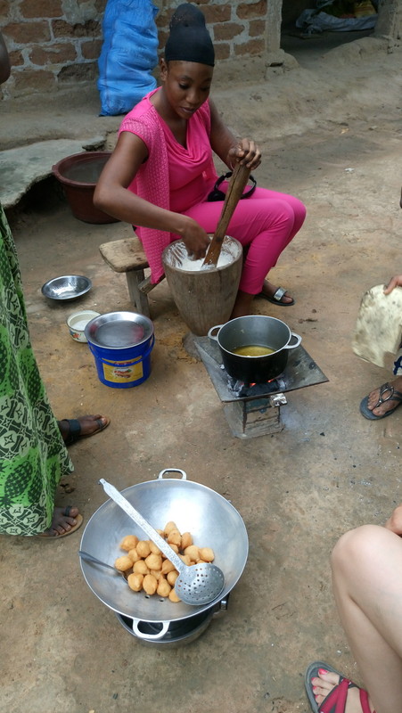 Autor: Jordi Izquierdo. Senegal. L’auto treball és important en comunitats pobres per incrementar els ingressos familiars. Un d’aquests treballs és l’elaboració casolana de menjar per vendre-ho en improvisades paradetes al carrer als passavolants, on et pots inclús assentar per menjar. Són autoempreses sovint d’una única persona. Aquí una dona fent una espècie de bunyols amb farina d’arròs, oli de palma i un petit fogonet.