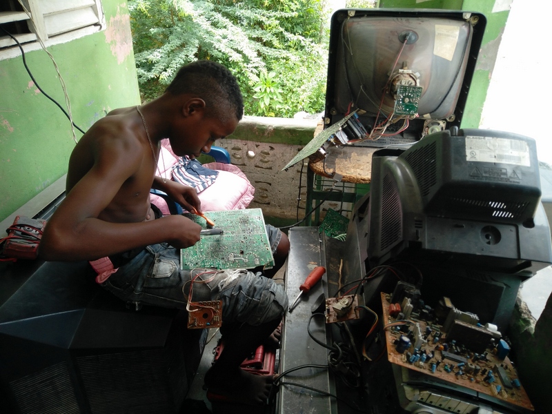Autora: Ana Comadran. República Dominicana. L'Eudi aprèn electrònica arreglant televisors que desprès ven, per ajudar econòmicament a la seva família.