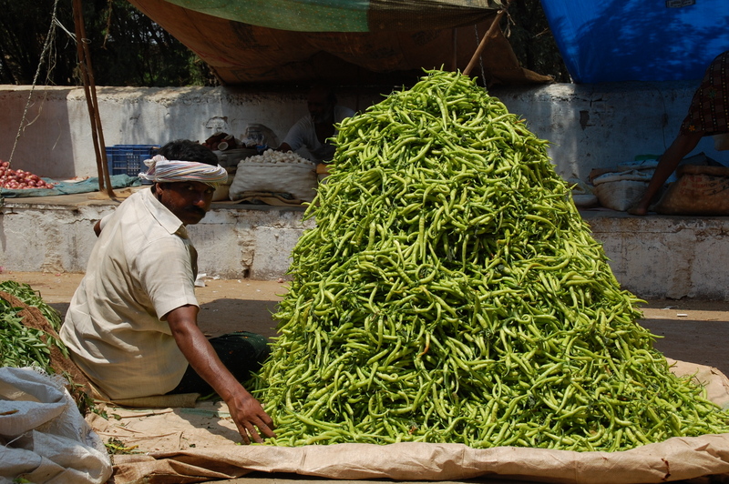 Autora: Andrea Llanas. Índia. La esperanza reflejada en el gesto de un hombre por vender en el mercado central de Koilkuntla el chili que su mujer y su hija han estado recogiendo durante días en las plantaciones cercanas al pueblo.