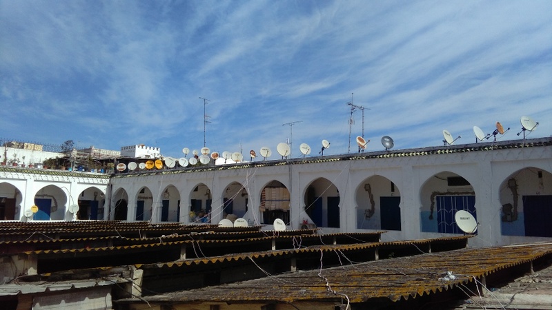 Autor: Joan Ramon Rossell. Marroc. El Fondouk Chejra conserva els darrers tallers de telers de Tànger, amb els artesans, els seus ingenis i un aparador de teixits de tota mena que després de regatejar ens endurem satisfets a casa. És una visita obligada i que cada vegada miro amb nous ulls. En aquesta darrera ocasió vaig descobrir aquest skyline tan endreçat i grotesc alhora: arcs apuntats, coberts d’Uralita i lluernes arrenglerades que queden subjugades al nou ordre imposat per les inevitables antenes parabòliques.