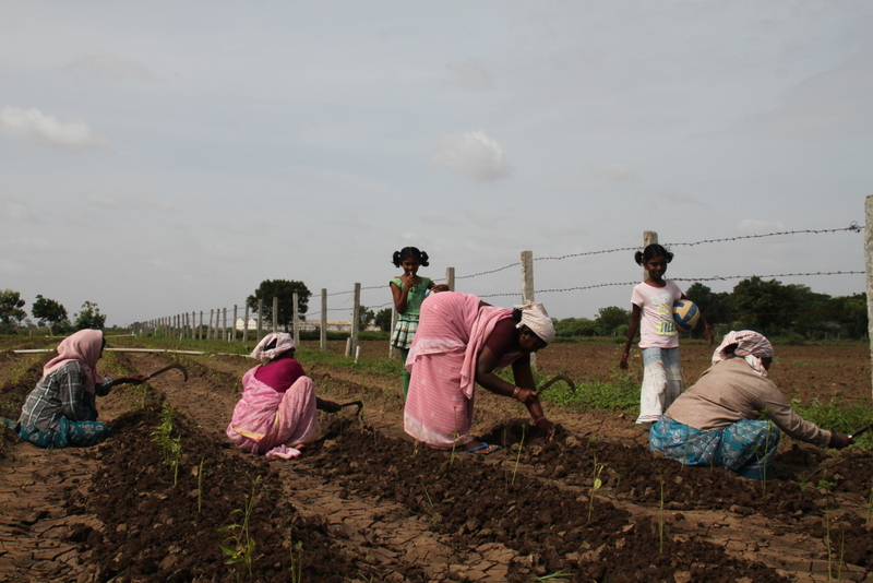 Autora: Elisenda Planell. Índia. La imatge vol mostrar la duresa del treball al camp, on la dóna hi te un paper molt important. Un treball delicat i minuciós, amb cura. Unes dones, que de petites, com les que es veuen a la imatge, podien gaudir del joc i acompanyar a les mares, tietes i àvies en aquesta tasca.