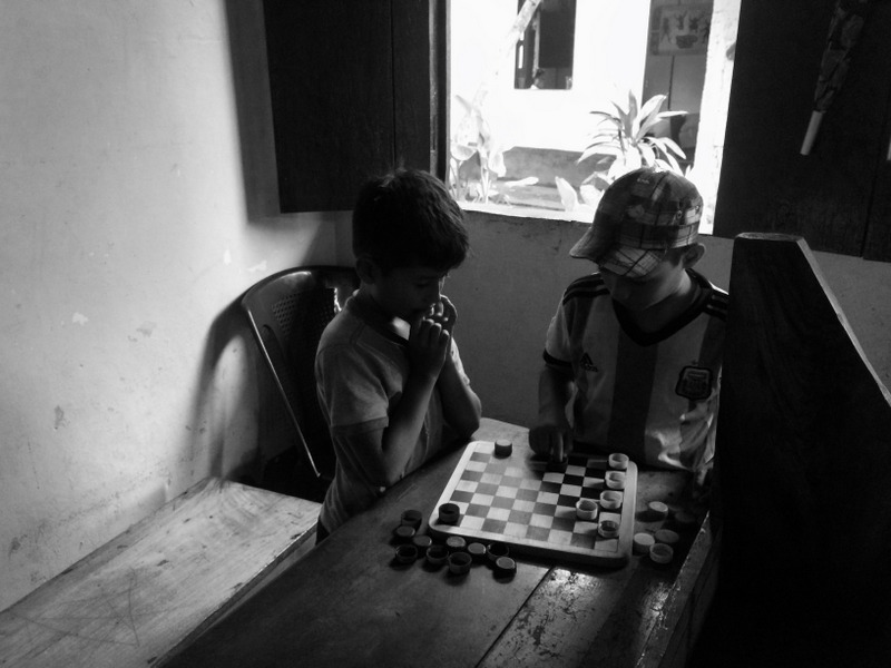 Autora: Mariona Carós. Nicaragua. En aquesta imatge podem observar dos nens de 7 anys aprofitant els taps d'ampolles de colors diferents per jugar a les dames. A falta de recursos, les mestres de l'escola EL Hogar Luceros del Amanecer treuen el màxim partit del que tenen i fan que els seus alumnes s’il·lusionin per aprendre.