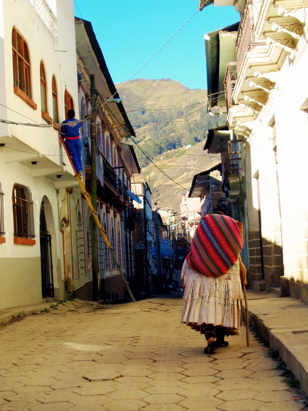 Autora: Anna Freixas. Bolívia. És freqüent veure aquestes imatges en les poblacions de Bolívia. Les "cholitas" carreguen a l'esquena els productes que vendran al carrer, mentre els homes realitzen tasques de construcció amb una seguretat mínima i del tot insuficient.