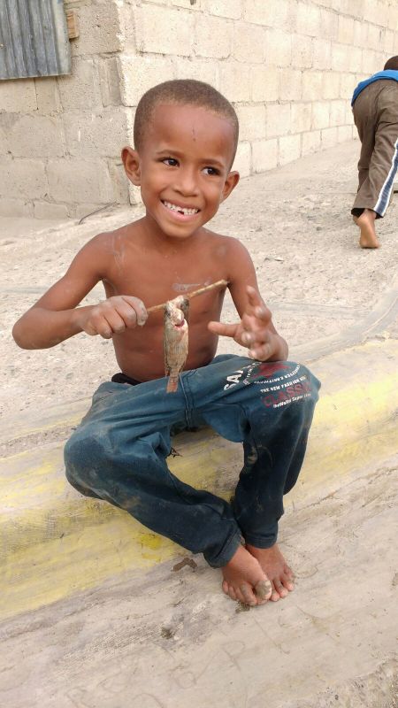 Autor: Eduard Ballvé. República Dominicana. El Jefferson juga amb un peix que acaba de pescar amb un pal al canal d'aigua contaminada, un peix que posteriorment es volien menjar alguns nens, amb totes les malalties que podria comportar.