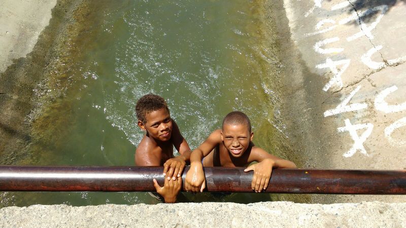 Autor: Eduard Ballvé. República Dominicana. Dos nens amb mirada desafiant es pengen d'un conducte que travessa el canal. No tenen por a fer-se mal, una actitud habitual en els nens del poble.