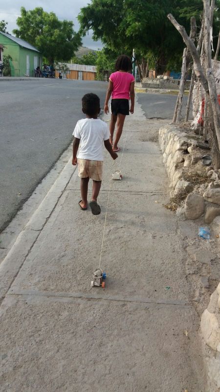 Autora: Carlota Comellas. República Dominicana. Tot i semblar una foto normal i corrent d'uns nens arrossegant els seus cotxes de joguet, si ens hi fixem podem veure que aquests cotxes han estat confeccionats per ells mateixos a partir de bricks de llet i taps.