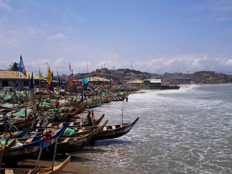 Autor: Pere Camps. Ghana. S'observa un gran nombre de cases i barraques al fons i un gran nombre de barques de pesca en un primer pla. La fotografia ens mostra la densitat de població que viu concentrada en aquella zona costera, al mateix temps que el subdesenvolupament d'aquesta societat, que sembla que visqui en un temps aturat.