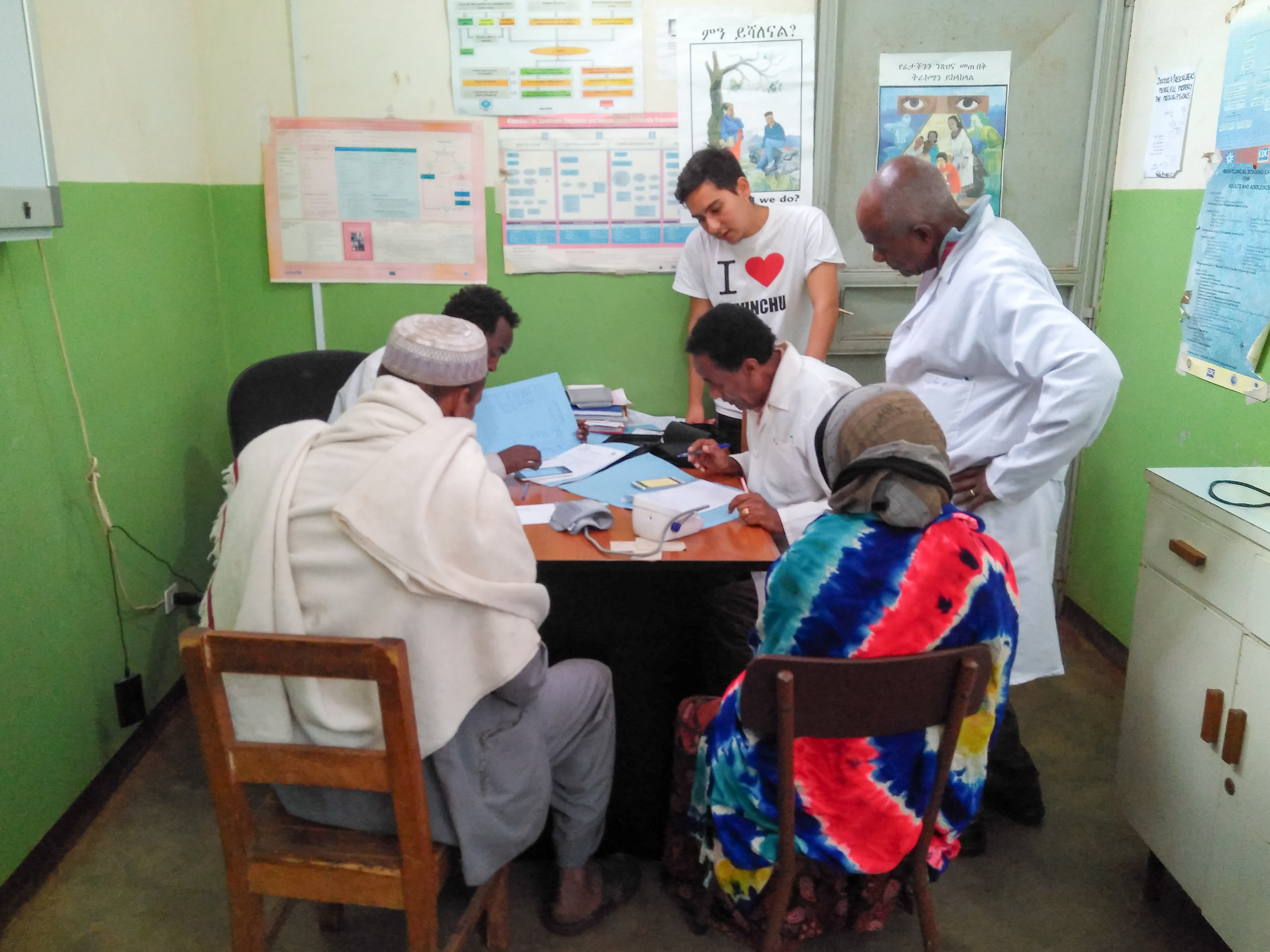Etiòpia. Després de vàries tutories de com utilitzar un smartphone i, en especial, de com utilitzar l’Open MRS; metges, infermers i un membre del nostre equip cooperen per recollir les dades mèdiques dels dos pacients d’esquenes a la càmera. Sobre la taula, unes carpetes blaves que seran història quan les milers d’aquestes quedin substituïdes per l’ús de l’smartphone i una base de dades dins un servidor.