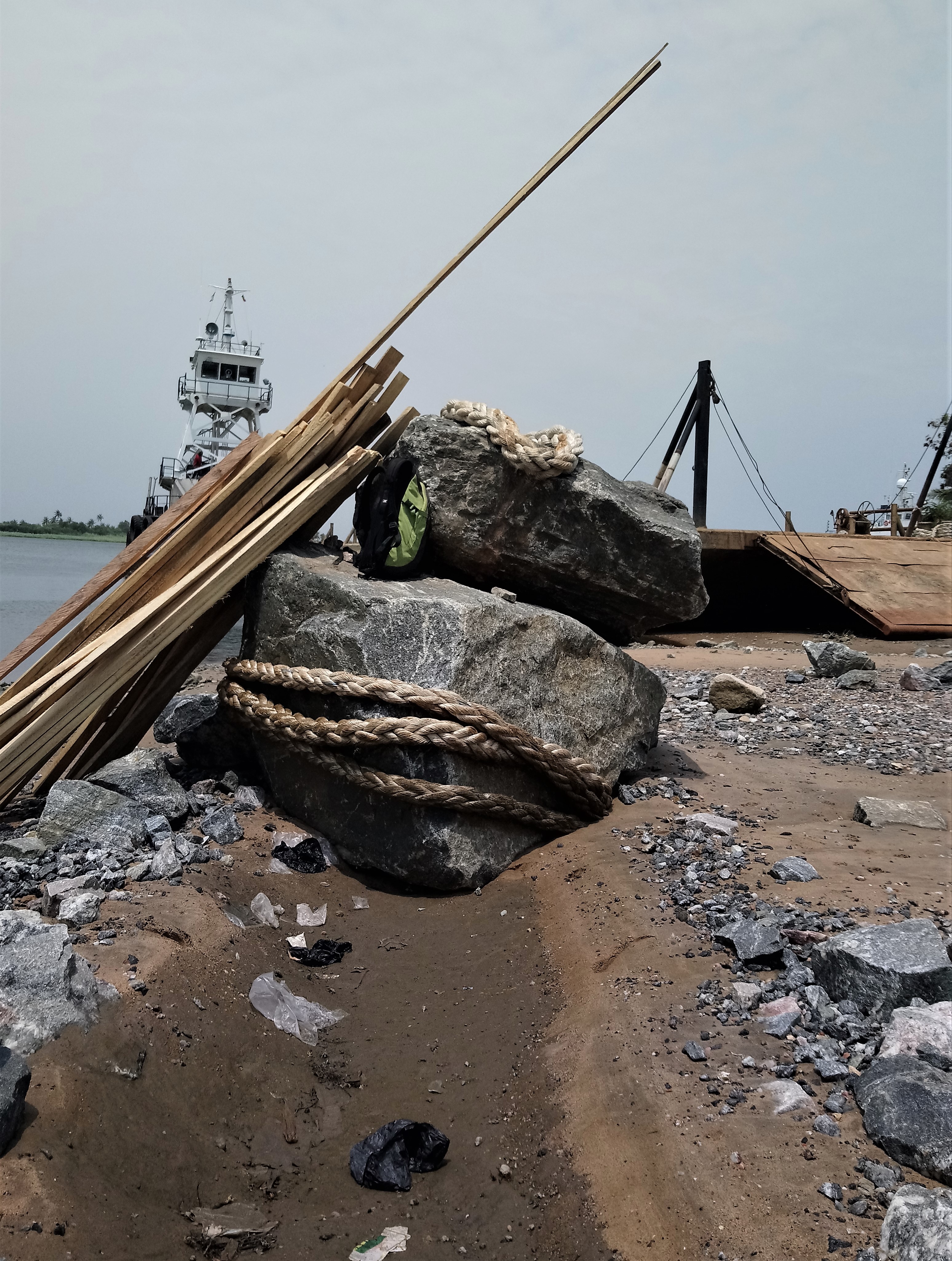 Ghana. En aquesta imatge, es mostra el conjunt dels llistons de fusta que vàrem anar a buscar prèviament a un serrador que es trobava a les afores de Kasseh, un poblat molt conegut pel seu exòtic mercat amb infinitat de productes que els propis venedors elaboraven. Tot i aconseguir el material, va ser una tasca molt complexa pel fet del transport. A Ghana, el medi de transport més utilitzat és la moto, el cotxe o la furgoneta (Tro-Tró), això suposa que el material no es pugui transportar tan fàcilment ja que la furgoneta o (Tro-Tró) ha de ser compartida amb més ciutadans dels poblats, i la moto no ens era gens útil per poder moure les fustes. Per tant, finalment vàrem optar per agafar un taxi i transportar-les fins al embarcador d’Ada Foah sobre la baca del vehicle. Degut a que aquestes fustes, havien de ser transportades fins a la illa d’Azizakpe on es trobava la barca, mentre esperàvem al patró de la llanxa que ens portaria fins allà, les vam recolzar sobre la gran roca de la fotografia. Posteriorment, aquestes un cop a la illa, les utilitzaríem per acabar amb l’estructura de la barca i per tant, acabant amb la realització de la coberta d’aquesta.