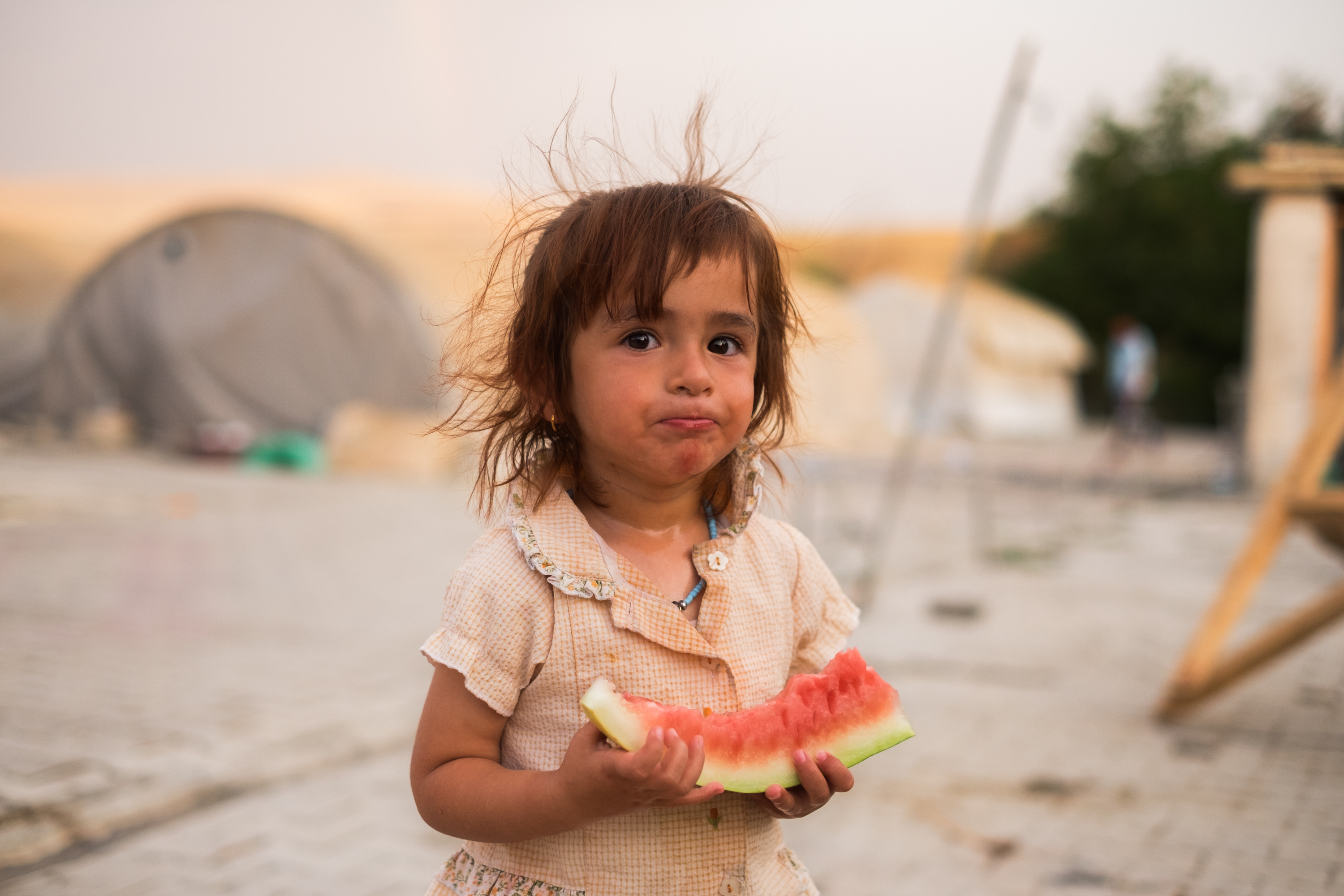 Turquia. Radia llegó al campo de refugiados de Batman (Kurdistan turco) hace dos años, huyendo del genocidio del ISIS contra el pueblo yazidi. La vida en el campo es monótona para estos niños ya que carecen de escuela. Esta región es famosa por sus riquísimas sandías, que nunca faltan en el campo.