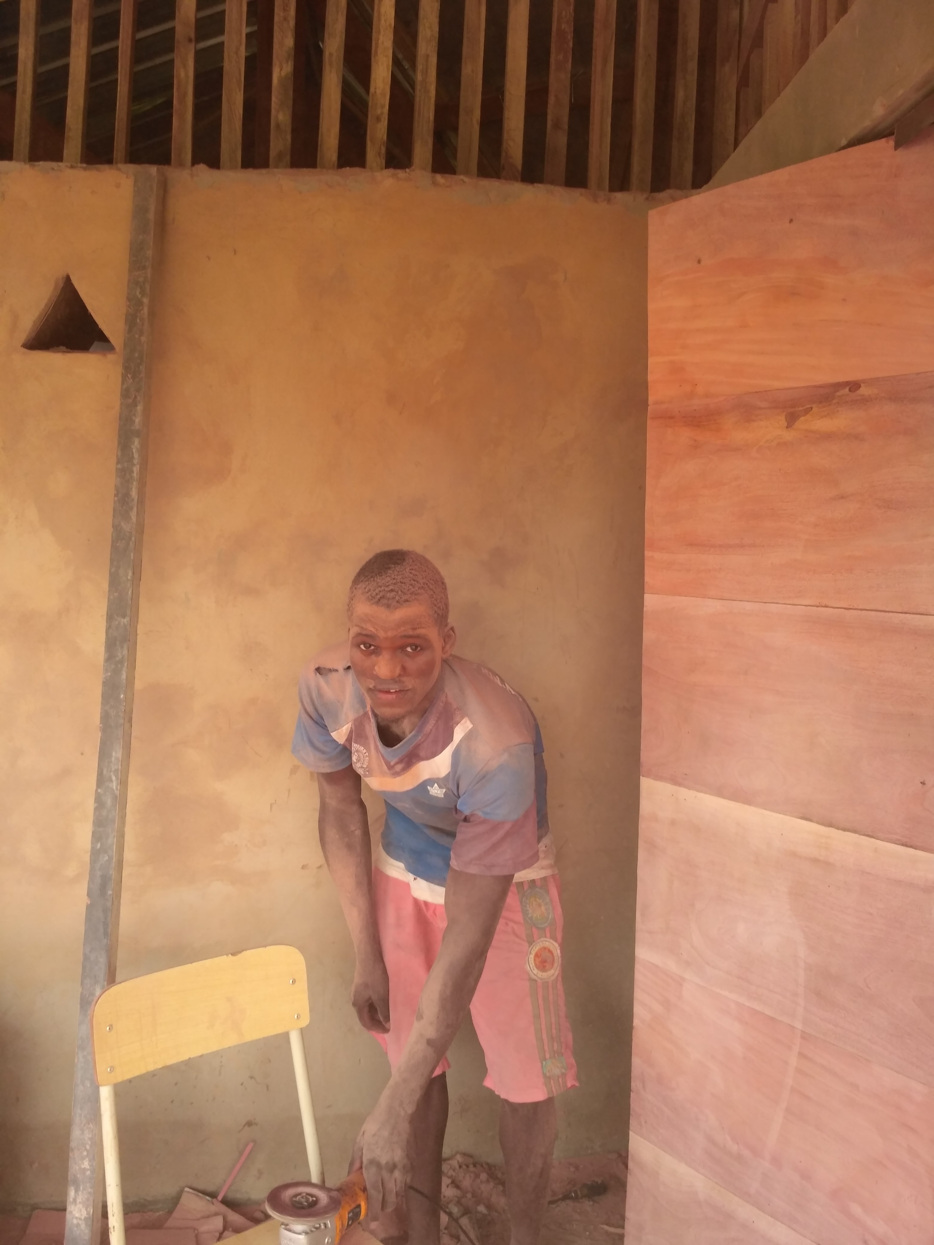 Senegal. Cansament i suor. Ja casi ho tenim! En les darreres hores per acabar els últims detalls de la bilioteca, en Kalilou ho dóna tot i més. “Se m’enfuma la pols! Això ho acabem ja!” I dit i fet.